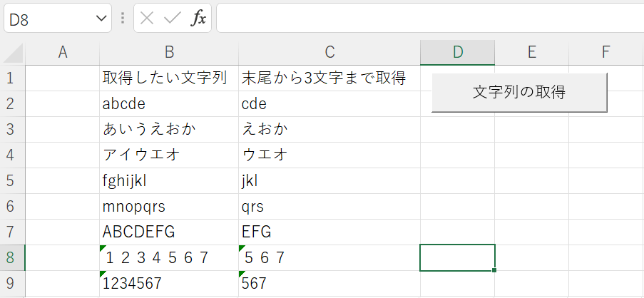 Right(“あいうえおかきくけこ”, 7)になるため”えおかきくけこ”が表示されます。