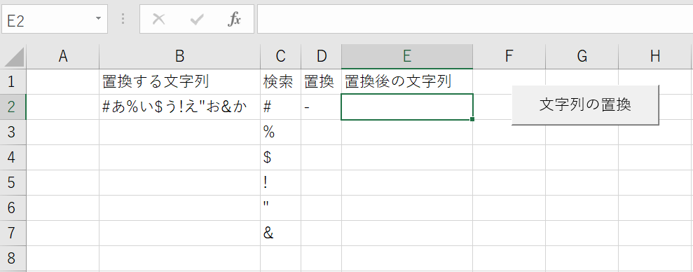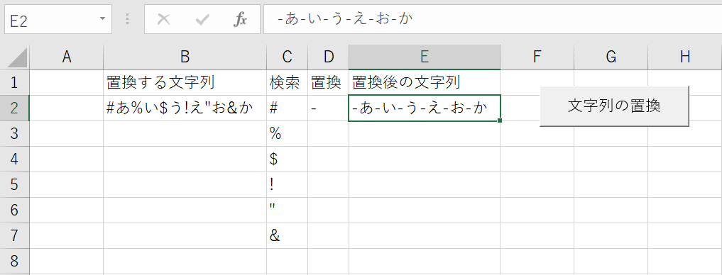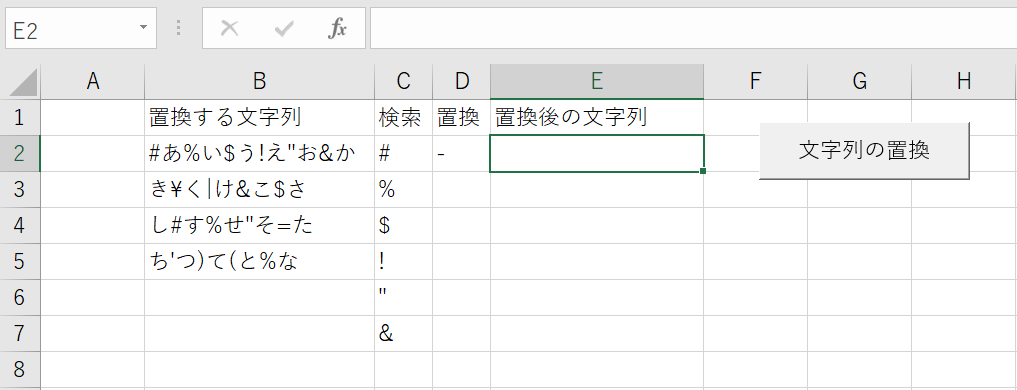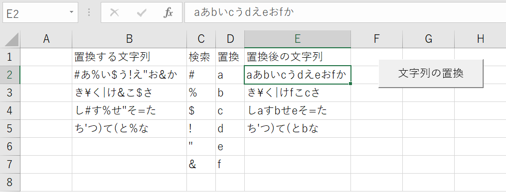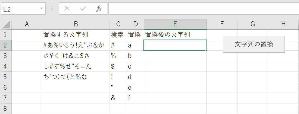 検索文字と置換文字は#→a、%→b、$→c、!→d、”→e、&→fという内容で置換します。