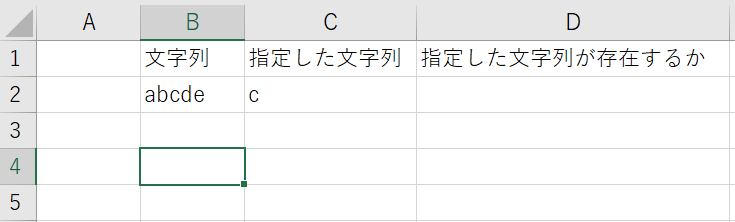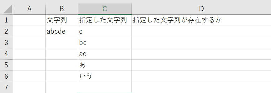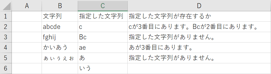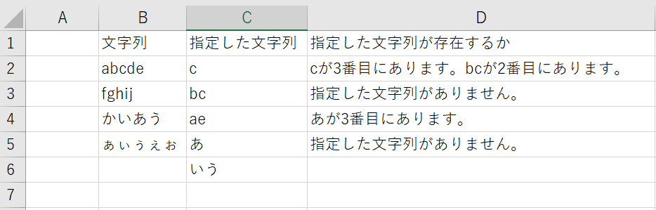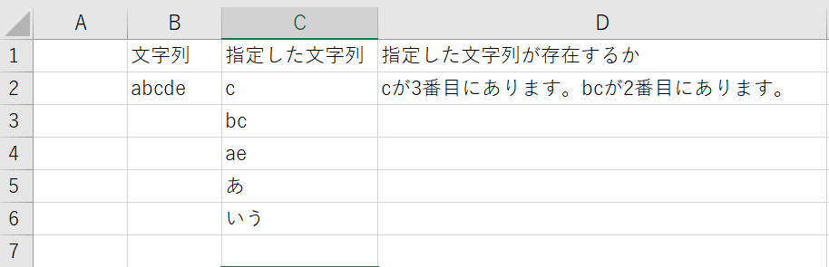 指定した文字列の”c”と”bc”があるため結果がD2に表示されます。