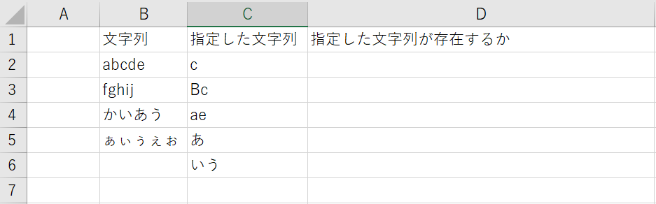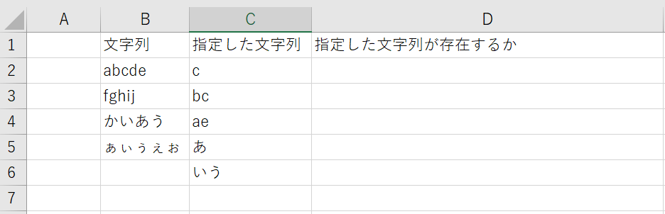B2の文字列を取得して、C列にある指定した文字列が含まれるか確認します。